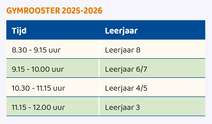 Voor de rust in de klas verzoeken wij u erop te letten dat uw kind op tijd op school aanwezig is, het onderwijsaanbod start om 8.30 uur.